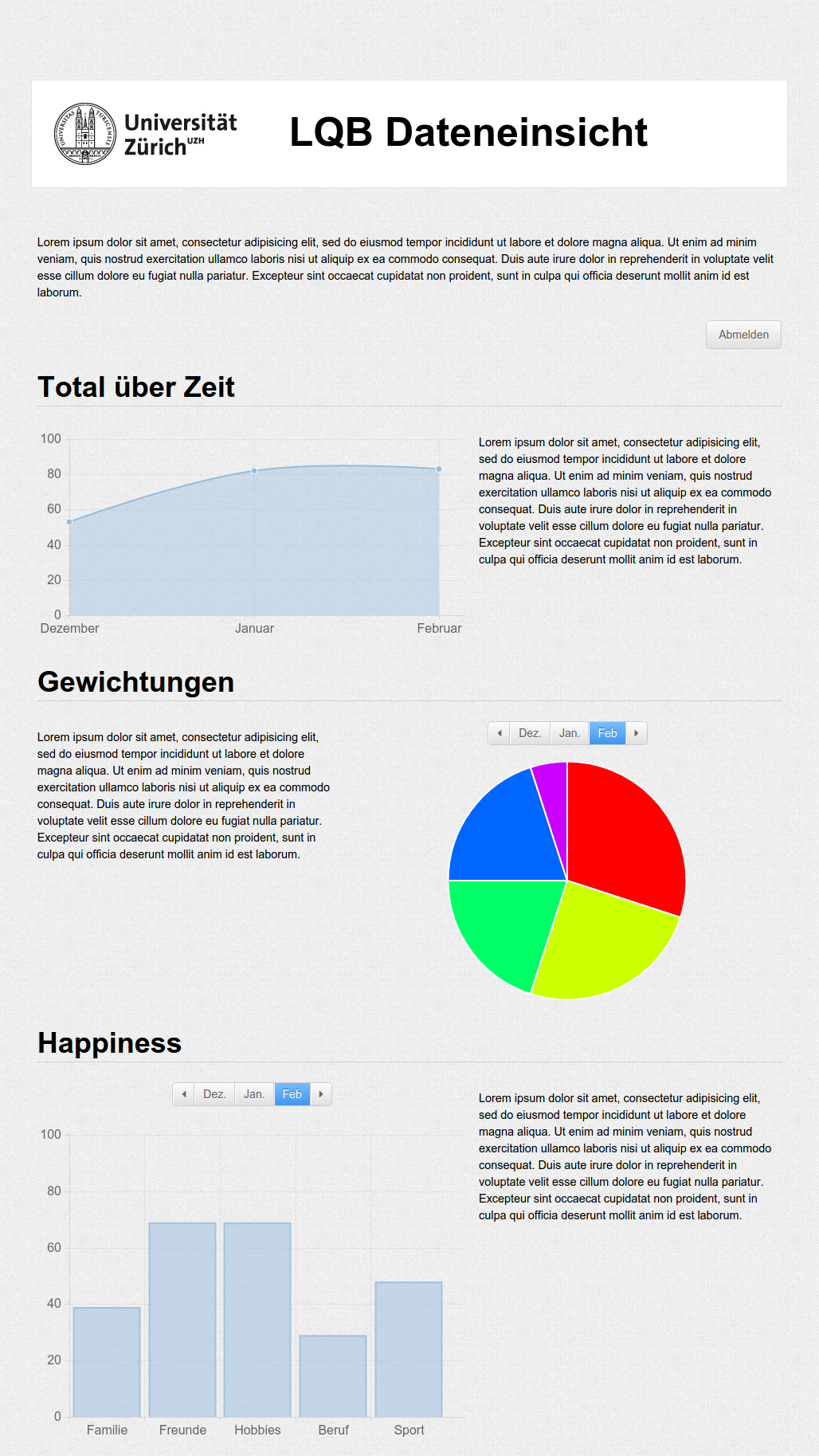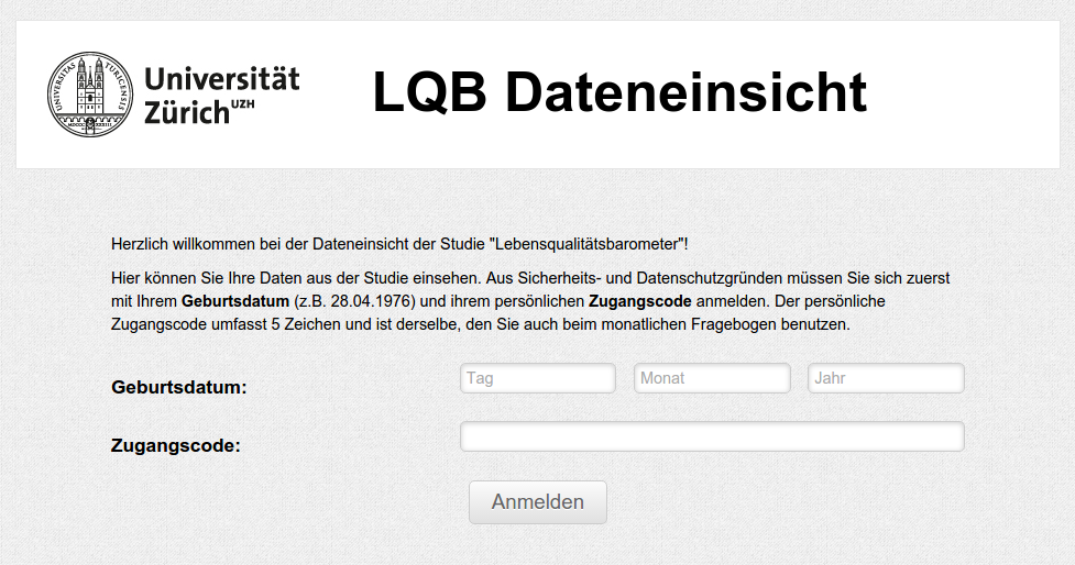 For the LQB study (Lebensqualitäts-Barometer - Life Quality Barometer) at the University of Zurich, participants fill out a questionnaire every month. The data that's gathered is available to the participants via a small website I developed. A participant can log in and the data of the last months will be displayed in interactive graphs.